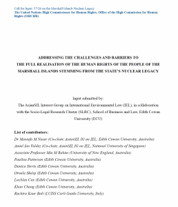 On 27 January 2026, members of the Asian Society of International Law (AsianSIL) International Environmental Law Interest Group (IELIG), in collaboration with the Socio-Legal Research Cluster (SLRC), School of Business and Law, Edith Cowan University (ECU), submitted their Response and Inputs to the United Nations Office of the High Commissioner for Human Rights’ (OHCHR) Call for Inputs on addressing the challenges and barriers to the full realisation of the human rights of the people of the Marshall Islands arising from the State’s nuclear legacy.